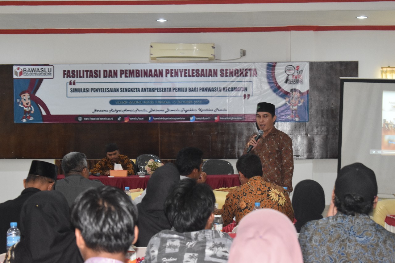 Koordinator Akademi Pemilu dan Demokrasi Indonesia Kabupaten Bangka Selatan Erik SH Hadir Dalam Kegiatan Bertemakan Fasilitasi Penyelesaian Sengketa Proses Antar Peserta Pemilu yang di selenggarakan oleh Bawaslu Kabupaten Bangka Selatan di Grand Marina Hotel Toboali Kamis, 12 Oktober 2023.
