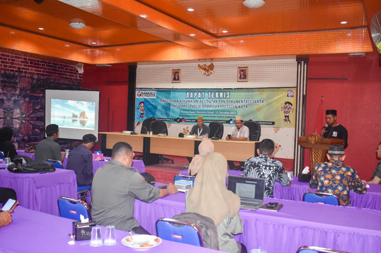 Toboali, Badan Pengawas Pemilihan Umum (Bawaslu) Kabupaten Bangka Selatan (Basel) gelar Rapat Teknis Pengelolaan Kehumasan, Peliputan dan Dokumentasi serta informasi Publik Bawaslu Kabupaten/Kota di Ruang Rapat Bawaslu Kabupaten Bangka Selatan, Jum'at (13/10/2023).