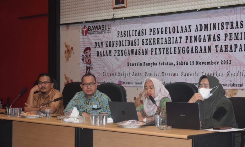 (Bawaslu) Kabupaten Bangka Selatan, menggelar Bimtek Fasilitasi Pengelolaan Administrasi dan Konsolidasi Sekretariat Pengawas Pemilu AD-HOC dalam pengawasan penyelenggaraan tahapan pemilu serentak 2024 di kantor Bawaslu Basel, Sabtu 19 November 2022.