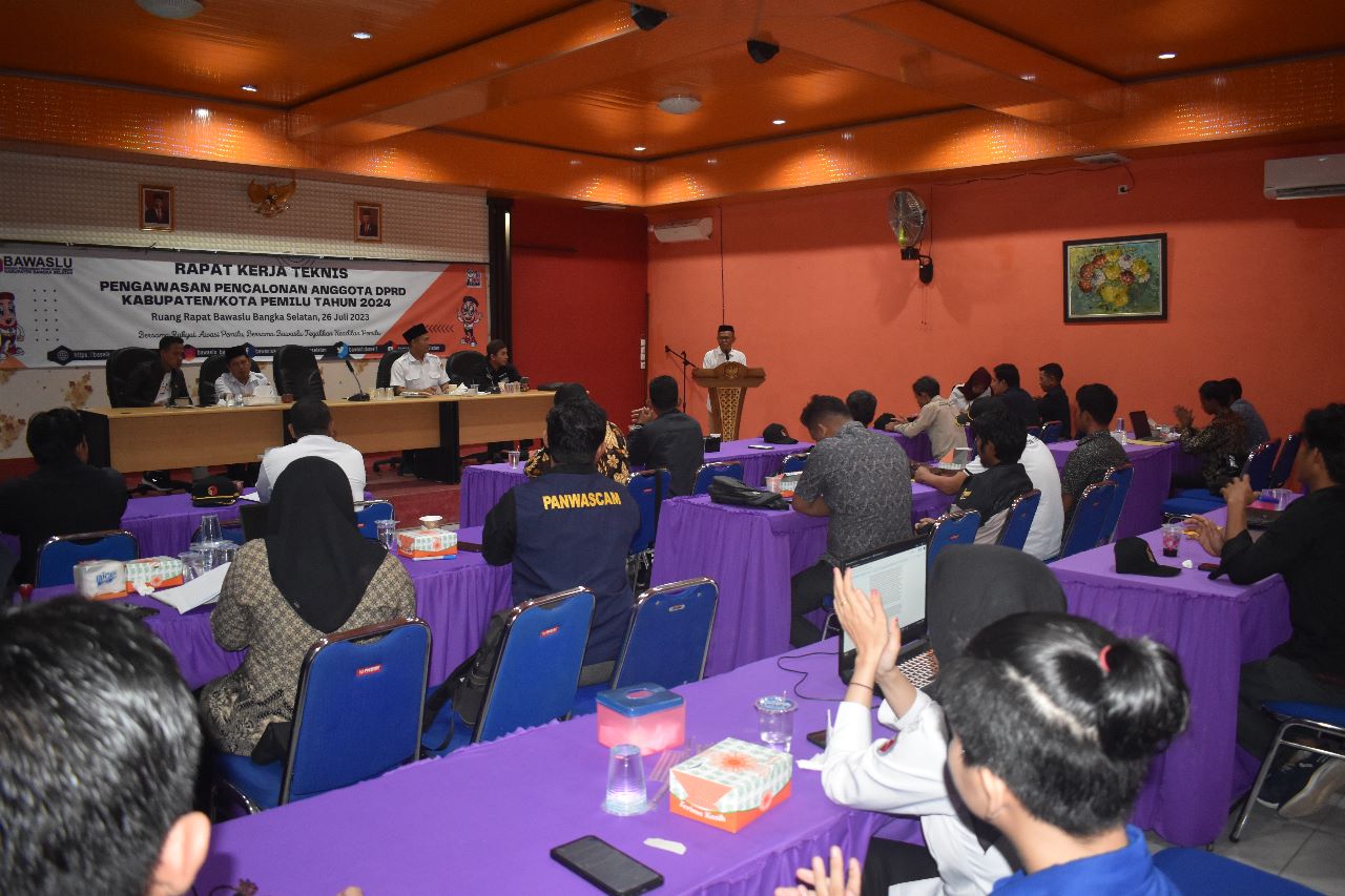 Toboali – Badan Pengawas Pemilihan Umum (Bawaslu) Kabupaten Bangka Selatan (Basel) menggelar Rapat Kerja Teknis (Rakernis) Pengawasan Pencalonan Anggota DPRD Kabupaten/kota pada Pemilu Tahun 2024 bersama Panwaslu Kecamatan Se-Kabupaten Bangka Selatan di Ruang Rapat Bawaslu Bangka Selatan, Rabu (26/07/2023)