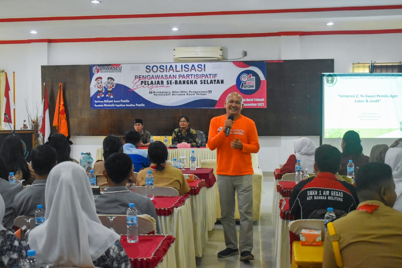 Toboali - Puluhan pelajar dari 17 sekolah di Kabupaten Bangka Selatan (Basel), Bangka Belitung (Babel) mengikuti sosialisasi partisipatif yang dilgelar Badan Pengawas Pemilihan Umum (Bawaslu) Basel pada Kamis (15/12/2022) di Grand Marina Hotel Toboali.