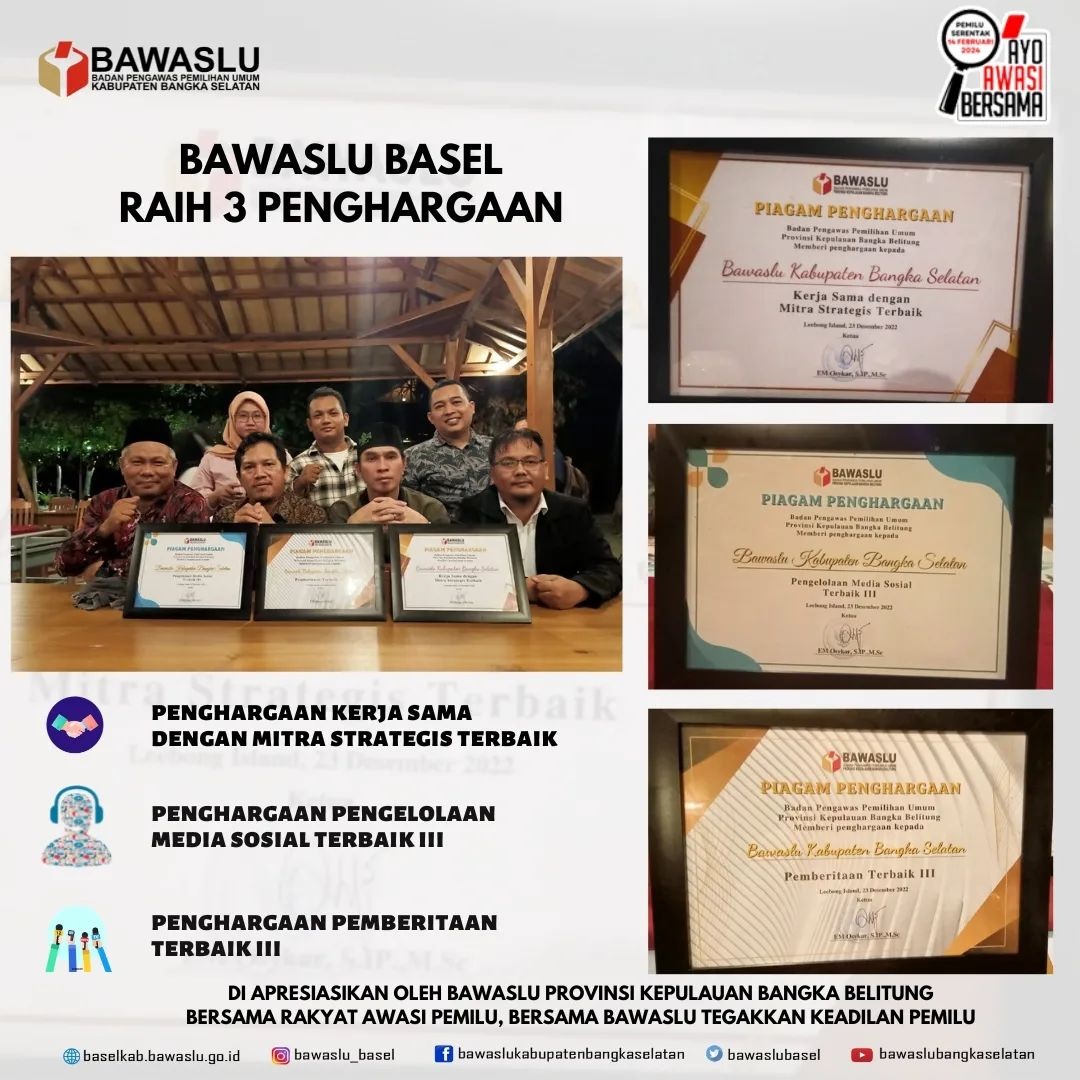 Leebong - Badan Pengawas Pemilihan Umum (Bawaslu) Kabupaten Bangka Selatan (Basel) meraih 3 Penghargaan yang diberikan Bawaslu Provinsi Kepulauan Bangka Belitung pada kegiatan malam Apresiasi yang dilaksanakan di Leebong, kamis 22/12/2022).