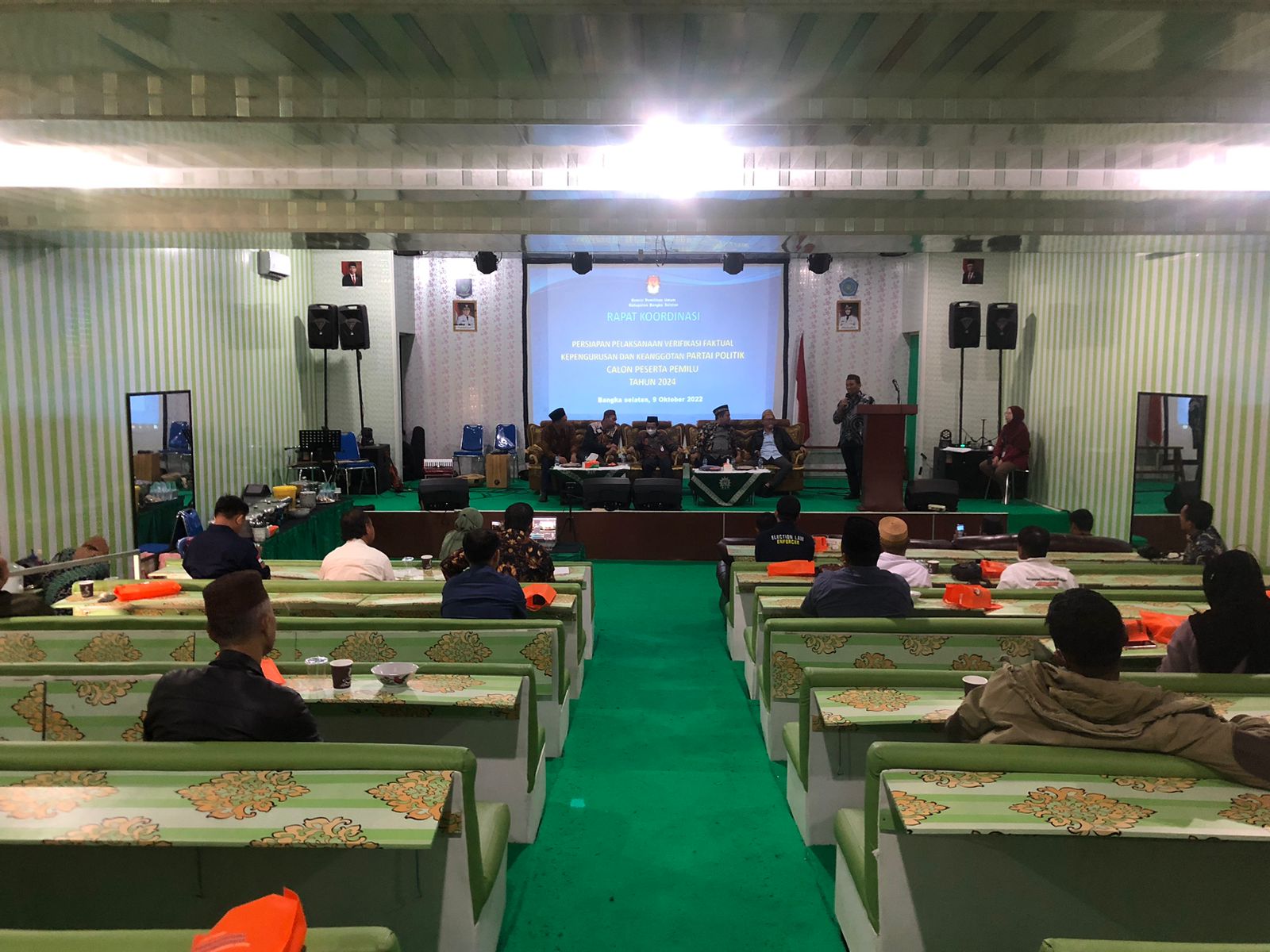 Toboalu - Bawaslu Kabupaten Bangka Selatan menghadiri undangan rapat koordinasi verifikasi faktual kepengurusan, kantor, dan keanggotaan partai politik calon peserta pemilu tahun 2024 yang dilaksanakan oleh KPU Kabupaten Bangka Selatan di Gedung Seni SMA Muhamadiyah Toboali. Minggu (9/10/2022)
