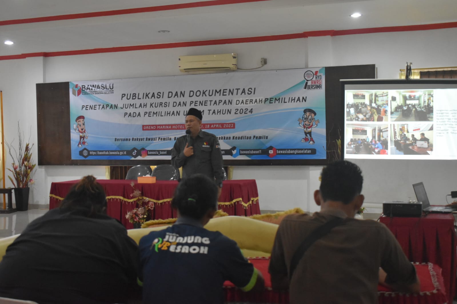Toboali - Badan Pengawas Pemilu Kabupaten Bangka Selatan menggelar Publikasi dan Dokumentasi penetapan jumlah kursi dan penetapan daerah pemilihan pada Pemilu tahun 2024, yang diselenggarakan di Hotel Grand Marina Toboali, Selasa (18/4/2023)