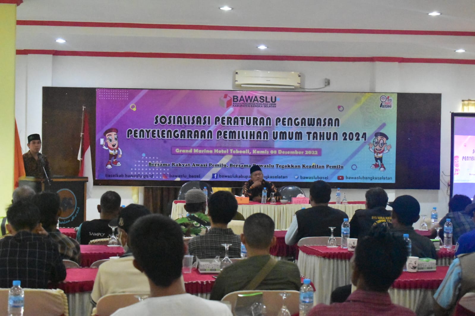 Toboali - Badan Pengawas Pemilihan Umum (Bawaslu) Kabupaten Bangka Selatan (Basel) kembali memberikan pemahaman tentang peraturan pengawasan penyelenggaraan Pemilu tahun 2024 pada Selasa (8/12/2022) kemarin di Grand Marina Hotel Toboali.